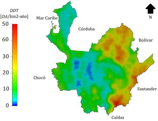 El territorio colombiano se encuentra en una zona con un alto número descargas atmosféricas anuales, la Figura 1 muestra el mapa de la densidad de descargas atmosféricas a tierra (DDT) para el departamento de Antioquia obtenido para los años 2012 a 2014, donde se observan zonas críticas tales como el este y nordeste del departamento, donde la variable DDT puede superar las 30 descargas por km2 en el año. Con relación a la incidencia de las DA en las redes de media tensión, estas tienen un efecto negativo en la confiabilidad e índices de calidad de energía de un sistema eléctrico [2], [7], [8], [9]. En particular, para las redes de EPM, como muestra la Figura 2, el alto valor de la DDT en regiones del norte del departamento de Antioquia, ha traído inconvenientes en la operación y mantenimiento, reportándose continuas fallas en aisladores en días de tormenta. La norma IEEE Std. 1410 recomienda incorporar aislamientos complementarios usando materiales dieléctricos para las crucetas o postes con la finalidad de mejorar el desempeño de las RD ante las descargas atmosféricas. De esta manera, el CFO combinado donde dos o más componentes en serie involucrados en el aislamiento de la red, dado por la Ecuación (1), se estableció en la norma IEEE Std 1410.