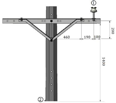 Para estos ensayos se empleó una fuente Phenix Technologies BK130, propiedad del laboratorio EATIC de EPM, la cual proporciona hasta 130 kV y una corriente máxima de 50 mA a 60 Hz. Se seleccionó una estructura de frecuente uso en las RD de 13.2 kV de EPM, conocida, según su norma de construcción, como RA2-001 [12], la cual emplea una cruceta de 1500 mm de longitud total e instalada en el poste mediante una diagonal metálica. La conexión de la fuente y el objeto de prueba, se realizó en los extremos ① y ②, como muestra la Figura 3, el objeto de prueba consistió en la combinación de postes de concreto, acero y PRFV con crucetas de acero, madera y PRFV, un tubo de aluminio 5/8” se utilizó para simular el conductor, soportado por un aislador ANSI 55-4; la tasa de creciemiento de la tensión fue de 1 kV por segundo, de acuerdo con las recomendaciones establecidas en la norma IEEE Std 4 [13].