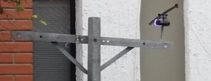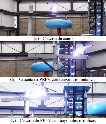 Para el caso de la estructura compuesta por poste conductivo y cruceta de PRFV con diagonales metálicas, como se observa en la Figura 6, el flameo en seco se presenta entre el conductor y el tornillo de fijación de la diagonal, que comprende una distancia de 200 mm aproximadamente. De esta manera, el flameo en seco obtenido fue de 95.75 kV y 91.19 kV para las estructuras con poste de acero y concreto, respectivamente.