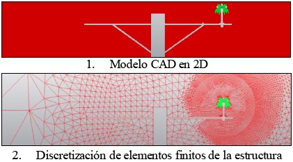 El análisis por elementos finitos aplicado a casos de evaluación de aislamiento y distancias en estrucutras de redes de distribución, ha sido presentado previamente por Biasotto et al [16], [17]. El programa Simulation Mechanical [18] es empleado en este trabajo para representar e ilustrar el uso de estructuras con diferentes características eléctricas. Se parte de un modelo CAD en 2D mostrado en la Figura 8(a), el cual será utilizado para representar la geometría de la estrucutra y se conservan las mismas dimensiones empleadas en las estructuras de los ensayos de las secciones anteriores e iustrado en la Figura 3. A continuación, en la Figura 8(b) se muestra la discretización empleada, la permitividad relativa de la porcelana, εr, se consideró igual 5.5, valor tomado como como referencia a 25°C y a baja frecuencia (<1kHz). Del mismo modo, se consideró el aire con εr = 1.
