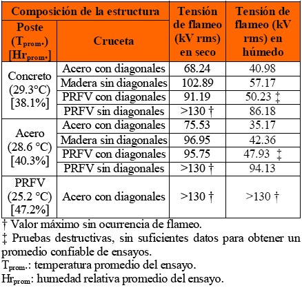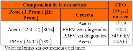En la Tabla 3, se muestra el promedio de diez ensayos para condiciones secas y húmedas, el valor reportado es el valor de la tensión que causa el flameo en el 50% de aplicaciones, para las diferentes composiciones de la estructura. Los valores son corregidos a condiciones ambientales estándar, teniendo en cuenta que los ensayos se realizaron a una altura de 1482 metros sobre el nivel del mar. Las pruebas en húmedo se realizaron con un aspersor de 36 agujeros de 0.5 mm de diámetro.
