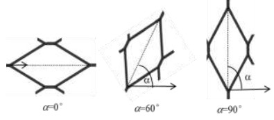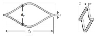 Los tubos enrollados de metal expandido fueron evaluados para los siguientes ángulos de celdas individuales: α=0°, α=60°, α=90° y mediante la combinación de celdas: α=90°/60° y α=60°/90° (Figura 2). De estas celdas combinadas, en la primera consideración, las celdas con α=90° se localizan en el lado exterior del tubo mientras que las celdas con α=60°, en el lado interior. Para la segunda combinación, es lo opuesto. Las dimensiones de las celdas de metal expandido utilizado fueron las siguientes: eje mayor dh: 65,20mm; eje menor dv: 27,50mm; avance a: 1,05mm y espesor e: 2,50mm (Figura 3).