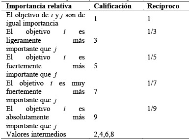 Cuando las comparaciones entre los pares son consistentes, es posible obtener estructuralmente el orden de importancia de las mismas, en caso contrario deben revalorarse y corregirse los juicios iniciales. Estas comparaciones son fundamentadas en una escala relacional según el orden de importancia relativa [30] tal como se muestra en la Tabla 2.
