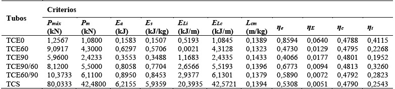 para cada geometría, es presentado en la Tabla 10.Con base en los resultados obtenidos en la Tabla 10, la solución más óptima para el diseño de un dispositivo de absorción de energía eficiente es el tubo de metal expandido con celdas individuales TCE0, seguido por aquellos de celdas combinadas con orientación TCE9060. El concepto más deficiente resultó el perfil con láminas sólidas TCS.