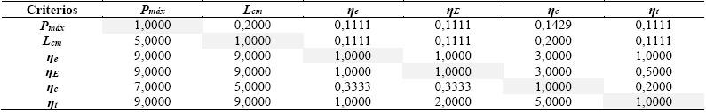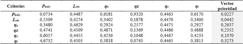 . En la Tabla 5, se presenta el análisis por pares para cada criterio según el método AHP. Subsecuentemente en la Tabla 6, se presenta la matriz normalizada y el vector prioridad.