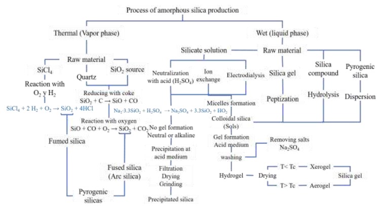 After carbon, silica is the second main element found in the earth crust. Silica is found in oxide or silicate form, in amorphous or crystalline structure [24]. In general terms, there are two types of silica, natural and synthetic. Natural silica is found in minerals such as quartz and flint, and also in plants such as bamboo, rice and barley. Synthetic silica is produced by different routes obtaining fibers, sheets, gel and powder. Those synthetic process can be classified in two routes: thermal and wet processes. Depending on the raw material and the applied pathway, it could be possible to obtain different kinds of synthetic silica such as sols or colloidal, gel, pyrogenic, and precipitated silica [43], [44] as is shown in Figure 1.