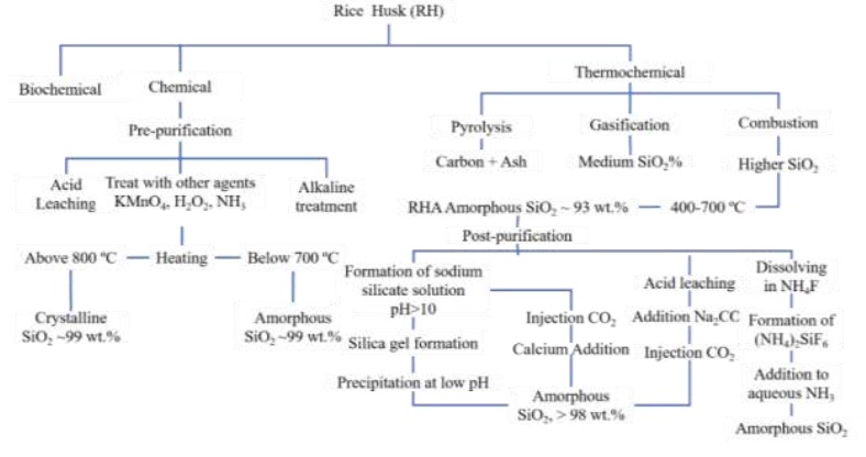 The RHA produced by combustion can be later treated (post-purification) with acid or alkaline substances to remove the inorganics contained (Zn, K, Na, Mg, Fe, Ca, among others) and hence, to obtain higher SiO2 content. As reviewed by Soltani et al. [28], those post-purification routes to precipitate silica from RHA can be classified into three pathways. The first one starts with RHA solubilization in alkaline medium (pH>10) to form silicate solution (generally Na2SiO3) which allows the gel formation. Then, the silica gel is precipitated in acid medium to obtain a silica with SiO2 higher than 98wt.%. Likewise, silica can be precipitated from the sodium silicate solution by adding CO2 and calcium. The second route is based on the silica extraction in an acid medium following by the addition of Na2CO and CO2. Finally, the third route is the dissolution of RHA in NH4F to form (NH4)2SiF6 which is later added to NH3 aqueous solution.