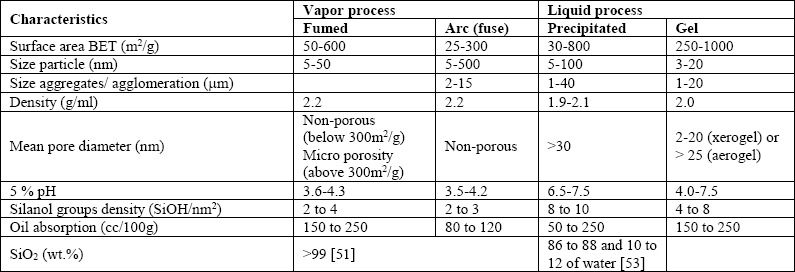 The structure is determined by an oil absorption test (usually named as oil absorption number (OAN)) given as a result 5 different levels: i) very low structure (VLS) when OAN is less than 75 mL/100g, ii) low structure (LS) for OAN between 75 and 125 mL/100g, iii) medium structure (MS) when OAN is between 125 and 175 mL/100g, iv) high structure (HS) for OAN between 175 and 200 mL/100g and v) very high structure (VHS) when OAN is above 200 mL/100g [48]. That way, the chainlike arrangement of primary particles results in a non-porous structure [44]. For instance, pyrogenic silicas do not show any porosity because of their aggregation in a chain-like form, while silica gels show porous structure [44], [49]. As it is shown in Table 1 silica gel has the highest surface area compared to fumed, arc and precipitated silica due to its high internal porosity.