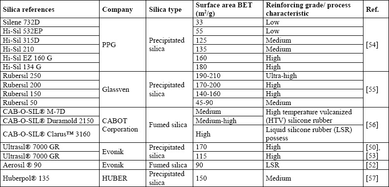Regardless of the production method, all synthetic silicas are amorphous in nature, colourless, odourless and tasteless. They are considered polymers produced by interlinking of SiO4 tetrahedron which ends in siloxane and silanol groups [43]. In conclusion, there are many kinds of commercial silicas which confer different reinforcing grades and properties to the final product (reinforced polymer). Table 2 shows the surface area and reinforcing grade reported by some producers of different commercial silica references.