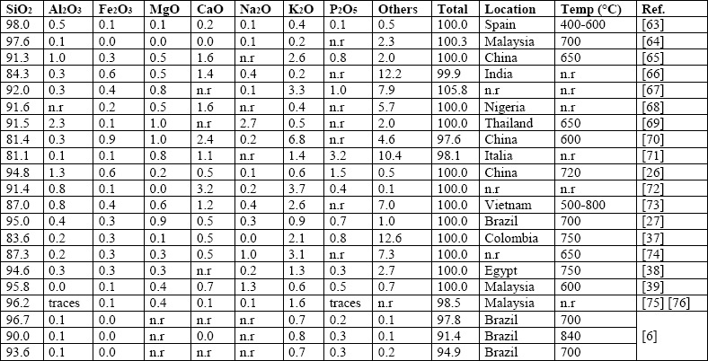 In general terms, the RHA produced by combustion is composed mainly of silica around 75-97 wt.% and other minerals such as K2O, Al2O3, CaO, MgO, Na2O y Fe2O3. The RHA composition and structure not only depends on the region where RH is cultivated but also on the combustion temperature and reaction time.