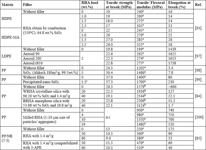 Ayswarya et al. [93] also studied the RHA effect on the mechanical properties of high density polyethylene (HDPE) as well as the influence of the HDPE compatibilization with maleic anhydride (HDPE-MA). In that research, the increase of different RHA (obtained in a furnace at 550°C) from 1.0 wt.% to 2.5 wt.% into uncompatibilized HDPE, showed a decrease steadily in tensile strength and elongation at break. The same phenomenon was observed in RHA/PP composites [84], [85]. The decrease of these two properties is attributed to the polymer-filler incompatibility [84], [85], [93]. However, the use of HDPE-MA improves the polymerfiller compatibility. The maleic anhydride is bonded to the HDPE and become a bridge between filler silanol group and polymer which leads to enhance the fillerpolymer compatibility [93]. The HDPE-MA filled with RHA in Ayswarya et al. [93] research work showed an increase in tensile strength and elongation at break with the increase of RHA up to 1.5 wt.%. Both HDPE-RHA and HDPE-MA-RHA blends showed an increase in the tensile modulus with the RHA loading increase as is shown in Table 5. That increase in tensile modulus is in accordance with some research works [84], [85]. In this regard, Ismail et al. [85] observed that the increase of RHA (mean particle size 5.4 µm; surface area 1.4 m2/g and density 2.2 g/m3) filled in natural rubber-linear low density polyethylene (NR-LDPE) blends showed an increase in tensile modulus of composites which means higher stiffness. Similarly, Fuad et al. [84] noticed an increase in flexural modulus in PP-RHA blend when the filler increase from 0 to 40 wt.%.