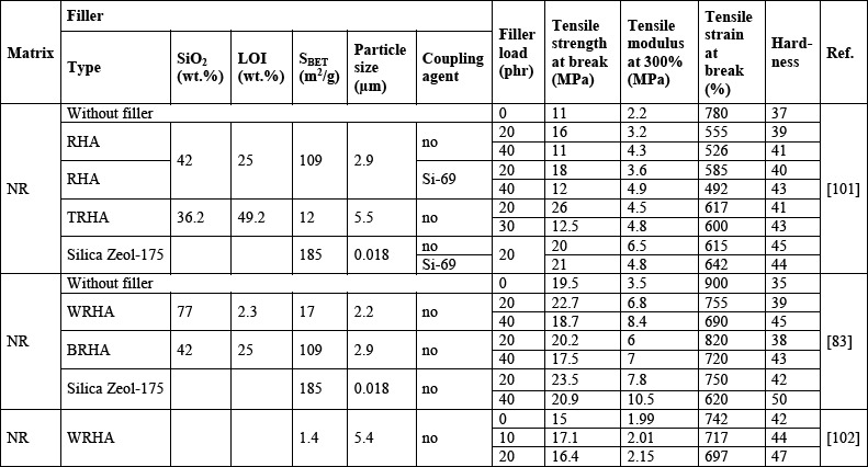 For instance, Da Costa et al. [101], showed a treatment with 20 wt.% NaOH and 12 M HCl in order to improve the mechanical properties of NR filled with RHA. As a result, the composites filled at 20 phr with treated RHA showed a higher tensile strength as compared with the NR filled at 20 phr with commercial silica (Zeol-175), and even higher than the Zeol-175/NR composite compatibilized with Si-69 [101].