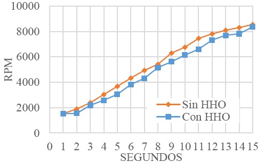 En la Figura 9 se observa que la variación de las RPM es proporcional al tiempo, dado que a medida que avanza el mismo se va alcanzado un mayor número de revoluciones. Para el sistema HHO se alcanzan 8360 RPM en 15 s, y para el sistema HHO se alcanzan 8550 RPM en 15 s.