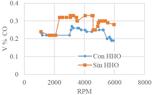 En la Figura 12 se observa que las emisiones contaminantes provenientes del monóxido de carbono (CO) disminuyen al agregar el gas HHO. Con el aumento de las RPM del motor, se presenta una disminución de las emisiones de un 13% al 18%.