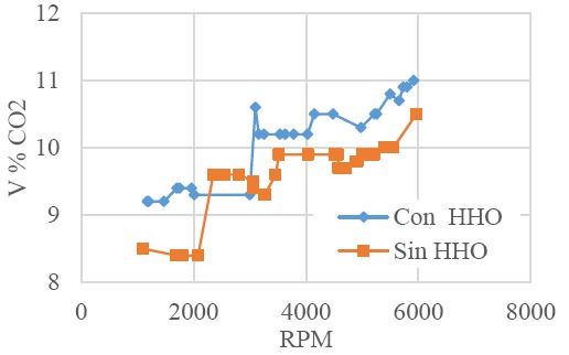En la Figura 13 se representa el incremento de CO2 con la adición de gas HHO, mostrando con esto una mejora en la gasolina que se quema en el punto óptimo de sincronización. Para el dióxido de carbono (CO2) se apreció un incremento que va desde un 5% a un 9% en volumen de CO2.