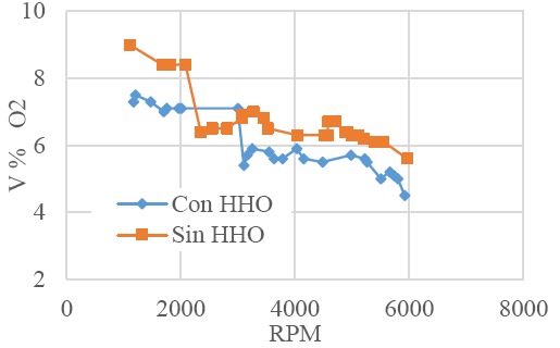 En la Figura 14 se representa la disminución de la cantidad de oxígeno en la mezcla cuando esta tiene el gas HHO, en comparación con la gasolina sola. Esto es debido a que se ha utilizado un volumen mayor de O2 en la combustión para la producción de CO2. La disminución registrada está entre un 19% y 20% en volumen de O2.
