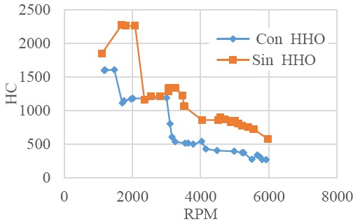 Por último, en la Figura 15 se muestra las ppm de los hidrocarburos (HC). Se ve también una disminución para la combustión con HHO, en comparación con la combustión de solo gasolina. Es decir, se están quemando mayores proporciones de combustible y no están saliendo crudas al ambiente. Las emisiones bajaron en un rango del 30% al 54%, de acuerdo a la variación de las RPM del motor entre 1100 RPM y 7000 RPM.