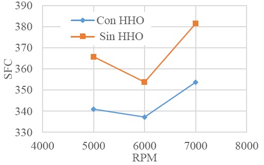 En la Figura 16 muestra la variación del SFC respecto a las RPM del motor, en donde se puede apreciar una disminución del SFC aproximadamente de un 7.3% al adicionar el gas HHO, en comparación cuando este no se utiliza.