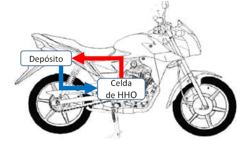 Para la instalación en la motocicleta, la celda se dispuso de manera que quede posicionada en un lado de la motocicleta y el tanque de depósito-burbujeador quede lo más alto posible respecto a la celda, Figura 2 esto con el fin de facilitar el movimiento del electrolito por gravedad para el llenado del dispositivo, ya que este debe estar, en lo posible, completamente lleno de líquido, para así aprovechar el área de contacto de las placas de acero con el electrolito.