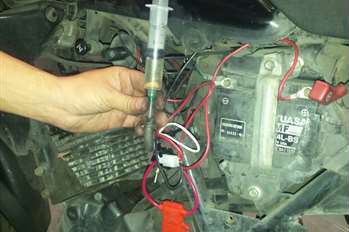 Este estudio se realizó utilizando el sistema propietario representado en la Figura 1, el cual consiste en una celda seca de HHO (1), conectada a una batería de 12 V (2), con un sistema de protección de sobrecargas (fusible) (3), la cual permite que se realice el proceso de electrólisis y se obtenga el gas. El gas realiza el recorrido hasta el tanque de almacenamiento del electrolito (4), que a su vez hace la función de burbujeador, de allí se dirige por una manguera hasta un filtro secador (5) que hace a su vez la función de válvula antiretorno de llama. Luego de este punto el gas es dirigido por otra manguera al filtro de aire de la moto (6), para ser suministrado en la cámara de combustión, entrando simultáneamente con el aire requerido para el proceso. De esta manera, se espera que el gas se mezcle con el aire y la gasolina en el carburador, y entren a la cámara de combustión para su encendido.