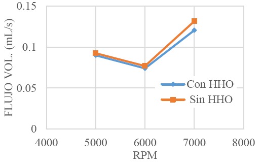 En la Figura 5 se representan los resultados de la prueba de consumo comparando los resultados con y sin adición de HHO. En esta gráfica se observa el flujo volumétrico (mL/s) de la motocicleta adicionando gas HHO y sin él, para valores de 5000 RPM, 6000 RPM y 7000 RPM. Se ha tomado este intervalo de RPM puesto que, a las 6000 RPM, aproximadamente, se presenta el mayor torque ofrecido por el motor según datos del fabricante. Para el consumo de combustible dado por el flujo volumétrico se observó un ligero incremento para la gasolina respecto a la mezcla gasolina-HHO. Se tuvo una disminución en el flujo volumétrico del 8.4% para cuando al mezclar gas HHO en la combustión con gasolina.