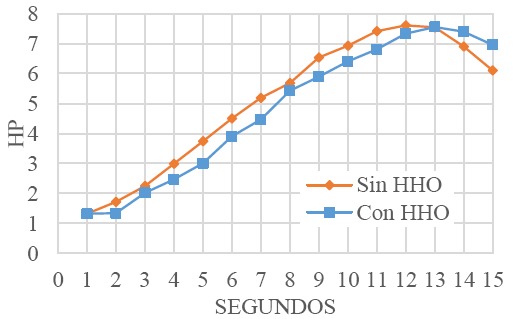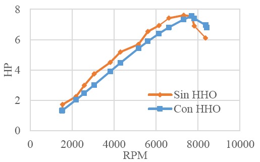 En la Figura 7 se observa como el sistema con gas HHO alcanza su valor máximo de potencia 7.54 HP a 7700 RPM, comparado con el sistema sin HHO, que alcanza 7.605 HP a las 7800 RPM. Estos resultados ayudan a complementar el análisis anterior con respecto al tiempo, dado que se producen mayores RPM en menor tiempo sin la adición del gas a la mezcla. No obstante, se observa que al momento de alcanzar la potencia máxima en ambos casos (con y sin HHO), esta empieza a disminuir, mostrando como la potencia de la mezcla sin HHO sufre una disminución mayor que para el gas HHO.