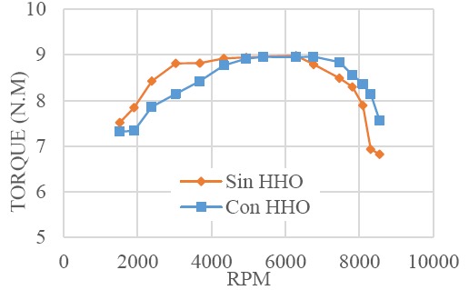 En la Figura 8 se observa que el motor alcanza su valor máximo de 8.98 N.m a 6290 RPM sin adicionar gas HHO a la mezcla de combustión, en comparación con 8.96 N.m a 6140 RPM con HHO. La Figura 8 también muestra como el torque disminuye más rápidamente en el caso de la mezcla de combustión sin HHO después de alcázar su torque máximo. Lo que lleva a concluir que el uso del sistema HHO disminuye el torque que entrega el motor de inicio a fin de la prueba.