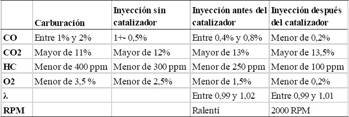 En la Tabla 1 se muestran valores porcentuales de algunos de los gases de emisión con diferentes configuraciones del sistema de inyección [30].