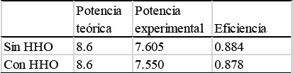 En cuanto a la eficiencia obtenida para el motor de 110 cm3 con la adición de gas HHO a la mezcla de combustión, se registraron valores de 0.87, y sin la adición del gas a la mezcla de 0.88. Estos valores indican una diferencia muy mínima, y que el sistema HHO disminuye ligeramente la eficiencia mecánica del motor. Se obtuvieron los valores de HP máximos alcanzados por el experimento, dando como resultado 7.605 HP a 7800 RPM sin el sistema de HHO, y 7.54 HP a 7700 RPM en un tiempo de 12 s y 13 s, respectivamente. Los resultados sin el sistema HHO son ligeramente mejores en relación a la potencia suministrada por el motor, obteniéndose como resultado un 88%, en contraste con un 87% de eficiencia obtenida con el sistema HHO. Mediante el análisis gráfico se mostró como la potencia y el torque disminuyen después de alcanzar sus puntos máximos más rápido en el sistema sin HHO.