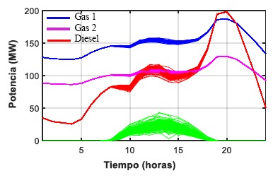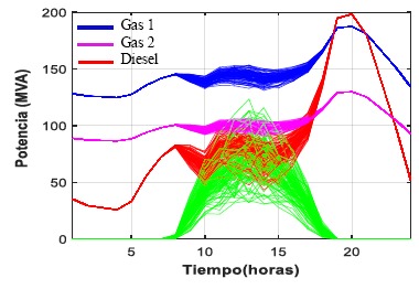 Para el análisis estocástico se realizaron 100 simulaciones variando la radiación solar, y se calcularon la utilidad marginal y la potencia despachada por las plantas en cada caso.