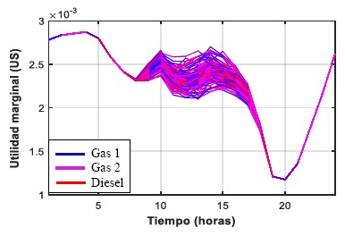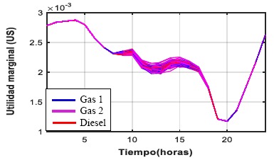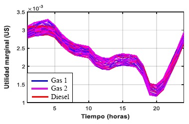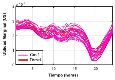 Los resultados muestran cambios en la utilidad marginal durante las 24 horas del día porque el GEo funciona de manera continua, afectanto negativamente la potencia generada por las plantas en firme en todo momento (figura 10).