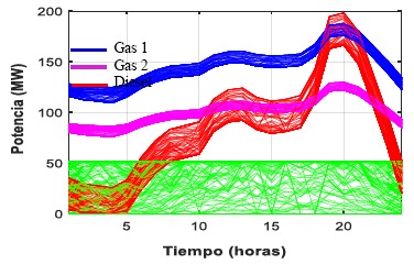 La potencia despachada por las plantas en firme se ve afectada por la inclusión de la GFv, dependiendo del costo de generación de cada planta. Las más afectadas serán aquellas con mayor sensibilidad a la variación de precio tal como sucede con las plantas térmicas a gas y diesel. En este caso (figura 9) la planta más afectada es la planta diesel (señal roja), que podría llegar a reducir la potencia hasta en un 58.6% según las simulaciones.