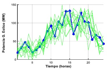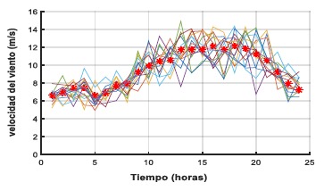 Para el estudio planteado se requiere conocer la potencia disponible en los generadores durante las 24 horas del día, lo cual implica crear perfiles de viento y de radiación solar hora a hora. El perfil de velocidad del viento se obtiene multiplicando el valor estocástico de la velocidad media por un perfil de viento normalizado, que incluye una desviación. En la figura 1 los puntos rojos representan el perfil sin dispersión y los demás representan los perfiles cuando se incluye la dispersión.