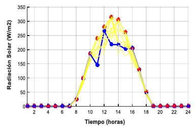 El perfil de radiación se observa en la figura 2. Este perfil se obtiene multiplicando el valor estocástico de la radiación obtenida, por un perfil de radiación normalizado al cual se aplica una desviación hora a hora. La figura 2 evidencia un comportamiento estocástico que representa no solo los cambios en magnitud, sino también los cambios en la radiación producidos por condiciones de nubosidad.