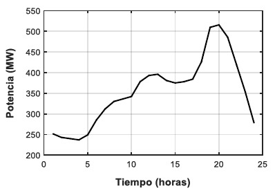 Se representa mediante una curva de demanda horaria típica, con una demanda máxima de 515 MW en la hora 20 (figura 3).