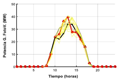 En este caso se tiene una representación estocástica que indica la potencia generada hora a hora y depende de los perfiles de radiación solar generados (Figura 4). La potencia generada sigue la misma forma que la curva de radiación incidente en el panel.