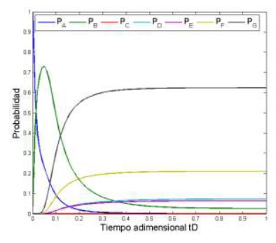 La Figura 3 muestra las probabilidades globales de encontrar cada una de las estructuras. A partir de los resultados se verifica la conservación del número de bloques en el sistema (la probabilidad se conserva), i.e, la suma de las probabilidades globales de los componentes es igual a uno para todo tiempo. En la Figura 3 se muestra la dinámica del ensamble de trímeros mediante el modelo propuesto y se observa que los trímeros más probables corresponden a los que están más favorecidos termodinámicamente (menor potencial químico estándar).