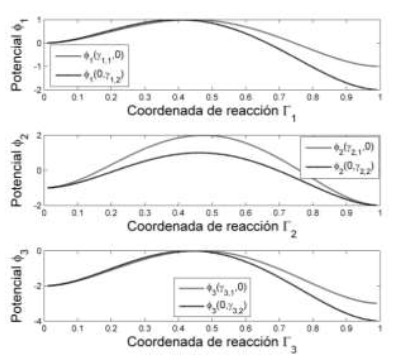 De acuerdo a las simulaciones realizadas, se obtuvieron las probabilidades asociadas a cada estructura en el sistema. La Figura 2 muestra las barreras potenciales en cada espacio para cada trayectoria posible. En este caso, para valores de