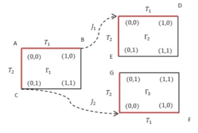 En la Figura 1 se ilustra la configuración de los espacios con los flujos entre las fronteras. Cada espacio es visto como un plano, en el cual solo tienen lugar los procesos en las trayectorias