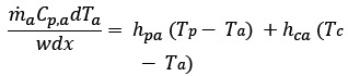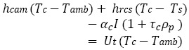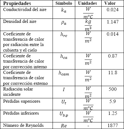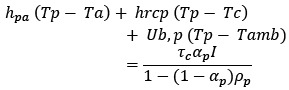 El balance de energía para la cubierta se muestra en la ecuación (1) como la suma de los siguientes términos: las pérdidas superiores entre la cubierta y el medio ambiente. Estas incluyen las pérdidas por radiación, convección y el ángulo de incidencia, la transferencia de calor por convección entre la cubierta y el aire, y por radiación entre la cubierta y el aire. El balance de energía del aire se muestra en la ecuación (2) representado por la transferencia de calor por convección entre el aire con la placa y la cubierta, y el balance de energía para la placa se muestra en la ecuación (3) que se representa por la suma de la transferencia de calor por convección entre la placa y el aire, la transferencia de calor por radiación entre placa, cielo y cubierta, y las pérdidas inferiores iguales a la energía absorbida por la placa en forma de radiación solar.