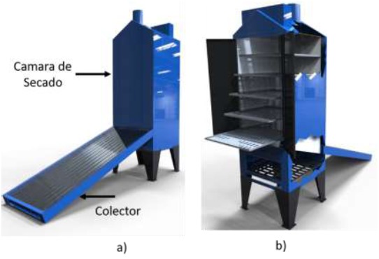 El análisis de secadores solares puede ser realizado a través de un modelo numérico del fenómeno físico del proceso de secado, dicho modelo generalmente se valida a través de un proceso de experimentación, sin embargo el proceso experimental toma tiempo, requiere de calibración, puesta a punto de instrumentos y algunas veces resulta costoso. Por otro lado el modelado matemático y numérico permite representar fenómenos físicos que ocurren en el interior del secador, posibilitando el estudio del fenómeno de secado y permitiendo predecir diferentes escenarios. En este trabajo, el modelo numérico desarrollado permite reproducir fenómenos de transferencia de calor y masa [12]. El modelo CAD renderizado del secador solar se puede apreciar en la Figura 1. Dicho modelo CAD se ilustra para describir la geometría del secador, el cual se compone de dos partes fundamentales, en primer lugar un colector solar, en donde ingresa el aire a temperatura ambiente y se calienta por medio de energía solar térmica, en segundo lugar se encuentra la cámara de secado, en donde se ubica el producto a secar, en este caso manzanas, cortadas en rodajas y dispuestas en bandejas; el aire caliente proveniente del colector solar entra a la cámara de secado por la parte inferior y es expulsado por la parte superior, después de haber interactuado con las manzanas, de tal forma que el aire a la salida tendrá un contenido de humedad mayor heredado de las manzanas y el producto tendrá un contenido de humedad menor deseado en el proceso de secado. El modelo matemático del secador solar se divide en dos secciones, en la primera sección se estudia el colector solar y en la segunda sección se estudia la cámara de secado.