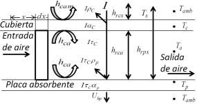 El balance de energía del colector se realiza para tres elementos cubierta, el aire y placa absorbente. La Figura 2 muestra un diagrama del colector en cual se analizan las interacciones energéticas que incluyen transferencia de calor entre la cubierta, el aire y la placa absorbente.