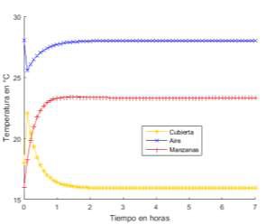 La Figura 3 presenta el cambio de temperatura para los principales elementos de la cámara de secado, que son las temperaturas en la cubierta, el aire interno y las manzanas. La temperatura es menor hacia la cubierta porque es un elemento de gran área que se encuentra en contacto con el medio ambiente. El aire viene caliente del colector por lo que su temperatura es mayor y esta se estabiliza con el tiempo, de igual forma la temperatura en las manzanas aumenta debido al intercambio energético dado por la interacción con el aire. La Figura 4 presenta la variación de temperatura para los elementos cubierta, aire y placa a lo largo de un colector inclinado 20°C. La temperatura de la placa tiene un leve descenso desde 79,4 hasta 72,83°C mientras la temperatura del aire y la cubierta aumentan. El incremento de la temperatura del aire es de 11, 6 °C y el de la cubierta de 19,23 °C.