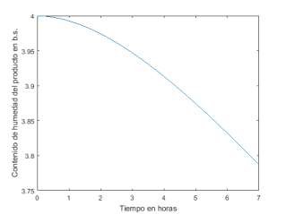 La Figura 5 presenta pérdida del contenido de humedad del producto, las manzanas pierden alrededor de 0,28 kg de agua/ kg de producto seco durante 7 horas.