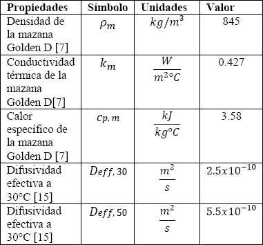 (6)Algunos parámetros son tomados de literatura y otros son calculados para realizar el modelo. Las propiedades térmicas del producto se muestran en la Tabla 1 y los parámetros utilizados en el balance de energía y masa se presentan en la Tabla 2.