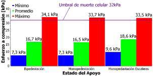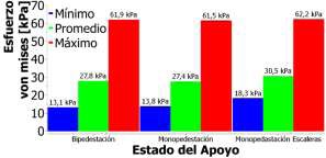 Los resultados de esfuerzos a compresión se muestran en la Figura 9, donde los valores máximos de esfuerzo están cerca de 34 kPa con una diferencia del 0.4 kPa estando sobre el umbral de muerte celular de 32 kPa, y donde se presenta la mayor variación de 2.3 kPa y 1.9 kPa en los esfuerzos a compresión mínimos y promedios respectivamente. Para los esfuerzos de von Mises, se encuentra una variación máxima de 5.2 kPa en los esfuerzos mínimos desarrollados. al igual que la tendencia de las deformaciones desarrolladas por el tipo de marcha, los esfuerzos a comprensión (ver Figura 9) y de von Mises (ver Figura 10) , no presentan un cambio significativo, pero hay zonas donde se desarrollan esfuerzos y deformaciones que están por encima del umbral de muerte celular, como es el caso de los esfuerzos y deformaciones máximos, donde estos no presentan una variación dependiente del tipo de marcha o condición de carga.