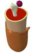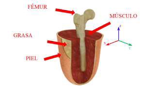 Con el objetivo de obtener la distribución y magnitud de los esfuerzos y deformaciones que se desarrollan en el tejido interno del muñón de un paciente amputado transfemoral, se desarrolla un modelo multicapa del muñón dividido en tres partes: músculo, grasa y piel. El modelo se construye a partir de la información presentada en [7], [9, 10, 11]. En la Figura 1, se muestra la representación multicapa del modelo.