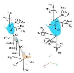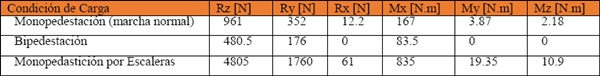 La carga aplicada al modelo fue la más crítica durante la marcha normal (fase de apoyo), esta carga se localiza en la parte rígida del socket, donde se une por medio de los adaptadores al tubo soporte del muslo de la prótesis. Para el cálculo de las fuerzas sobre el socket, se calcularon las reacciones sobre el talón del pie, empleando las fuerzas reactivas sobre el piso a través del talón del pie, los pesos de cada uno de los componentes de la prótesis y del muñón y las aceleraciones angulares (ver Figura 5). Se tomó como referencia el peso corporal de una persona de 88 kg y una estatura de 1.7 m [7]. La carga fue aplicada después de la fase de relajación durante 0.1 segundos. Para observar la influencia de las condiciones de carga en la generación de UP, se emplearon los valores de carga en los cuales la persona se encontraba apoyada en los dos pies (bipedestación) y cuando realizaba la marcha subiendo o bajando escaleras y ascendiendo o descendiendo por superficies inclinadas. En el caso de la bidipedestación las reacciones sobre la prótesis eran la mitad de las de la fase de apoyo de la marcha normal y en los demás casos, las reacciones aumentaron cinco veces. Para el análisis por elementos finitos se aplicaron las reacciones y momentos desarrollados por cada condición de carga como se muestra en la Tabla 2.