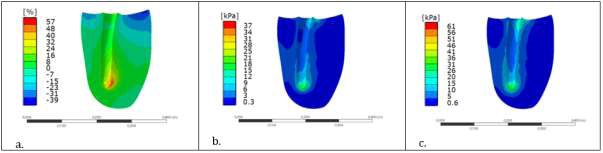 En este estudio se hizo la comparación de la distribución y concentración de deformaciones, esfuerzos a compresión, y esfuerzo de von Mises debido a las condiciones de carga. Se encontró que la mayor concentración de esfuerzos y deformaciones se presenta en el tejido muscular en la zona distal del hueso residual, como se muestra en la Figura 7. Los máximos esfuerzos y deformaciones ocurren durante la fase de calzado del socket, que corresponden a los primeros diez segundos del análisis según se muestra en la Figura 7. Cada uno de los esfuerzos se ven afectados en la fase de apoyo de la marcha sin superar el umbral de muerte celular (ver Figura 7 (a)). Las deformaciones presentan una reducción del 10 % en la fase de relajación en los tres segundos posteriores a la fase desplazamiento y un aumento del 2 % asociado a la fase de apoyo de la marcha (ver . Figura 7 (b)). Lo que indica que la mayor deformación y esfuerzo a compresión está asociada al momento en que la persona se calza la prótesis y se ven afectados por cada paso que da la persona.