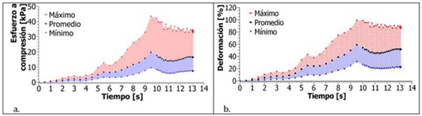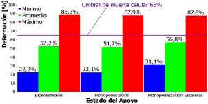 En la Figura 8 se muestran las deformaciones que se alcanzan en el instante en que la persona se encuentra en cada condición de carga (bipedestación, monopedestación y monopedestación en escaleras) donde se obtiene que las deformaciones desarrolladas en bipedestación y monopedestación, tienen una variación mínima de 0.1 %, y una máxima de 0.5 % para los valores mínimos y promedios respectivamente. En comparación con la fase de apoyo en pendientes o escaleras, se evidencia una variación del 9 % para las deformaciones mínimas, mientras que para los valores promedios de deformación hay un cambio del 5.6 %. Las deformaciones máximas se encuentran en el mismo margen con diferencias entre 0.3 % y 0.4 % sobrepasando los valores de umbral de muerte celular de 65 %, con valores cercanos al 88 % de deformación a compresión. A pesar que existe una variación en la magnitud de las deformaciones desarrolladas por las diferentes condiciones de carga, no hay un cambio significativo por el tipo de condición de carga cuando es aplicada durante 0.1 segundo.